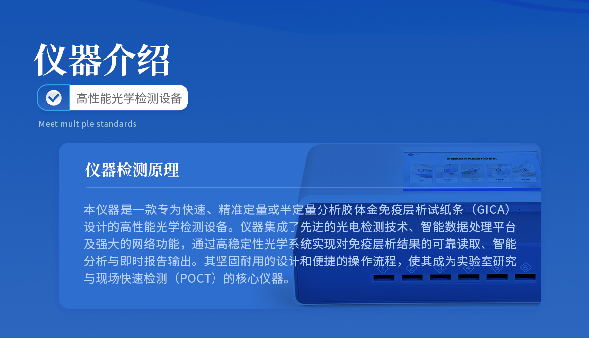 | 本仪器是一款专为快速、精准定量或半定量分析胶体金免疫层析试纸条(GICA)设计的高性能光学检测设备。仪器集成了**的光电检测技术、智能数据处理平台及强大的网络功能,通过高稳定性光学系统实现对免疫层析结果的可靠读取、智能分析与即时报告输出。其坚固耐用的设计和便捷的操作流程,使其成为实验室研究与现场快速检测(POCT)的核心仪器。 |