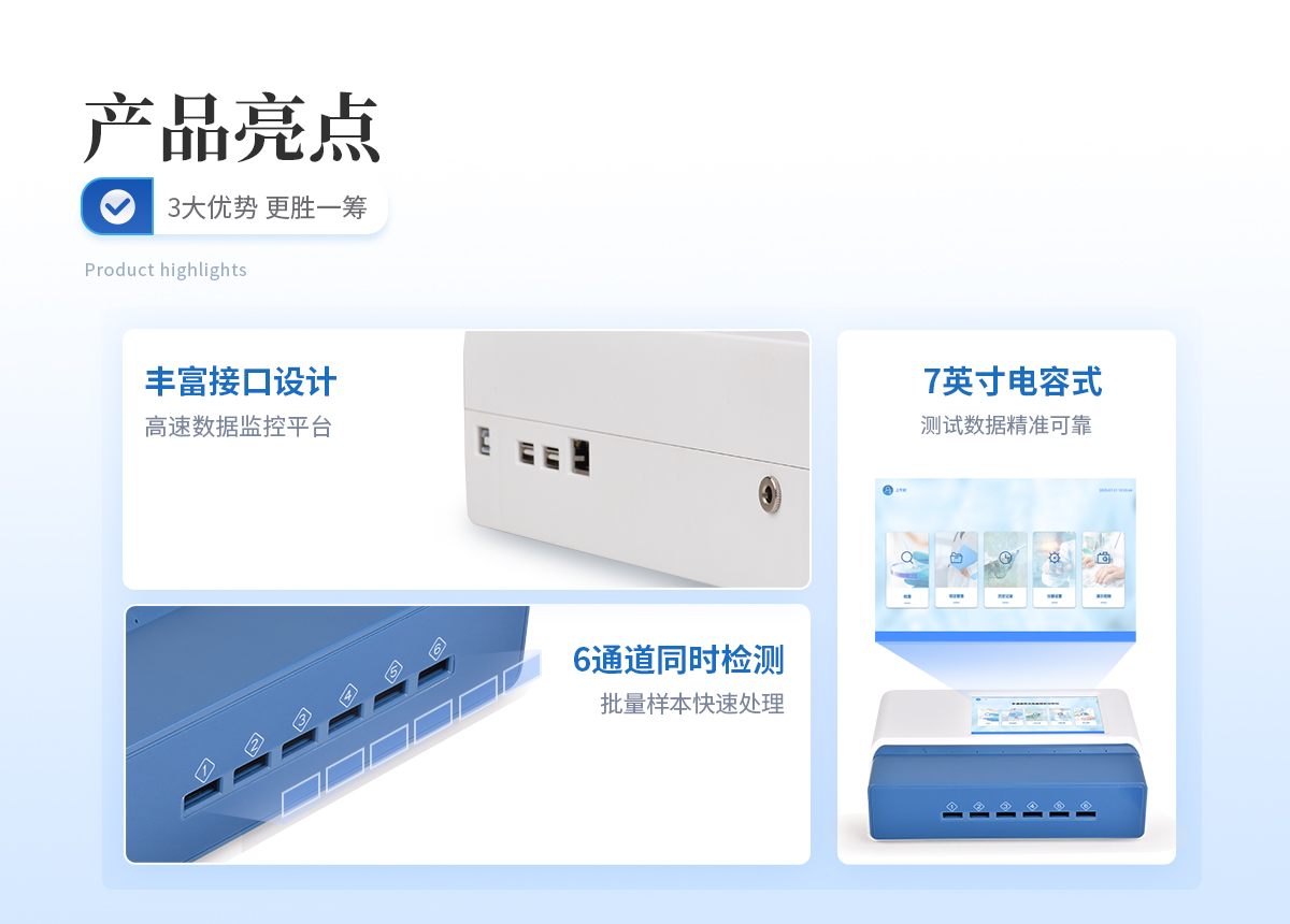 | 1、 手持式设计,电池供电,紧凑轻便,兼顾移动检测需求 | 2、 Android4.4系统,界面友好,操作简单流畅,无需外接设备; | 3、 8G超大容量内存,支持按日期灵活查询、预览、删除结果,并生成多样化专业报告。 | 4、 高精度光学系统:采用特定波长光源和光电传感器,减少环境光干扰。 | 5、 二维码扫描录入样本信息,避免人工错误 | 6、 内置热敏打印机,检测完成即可现场打印标准报告,提升工作效率。 | 7、 关键部件实时自诊断功能,保障仪器长期稳定运行。 | 8、 无线网络及蓝牙,构建完善的数据监控平台,实现数据实时上传、远程查询、统计分析和监管协同。 | 9、 通道内置孵育模块,为特定试纸条反应提供**温度环境。 | 10、 支持多种品牌/类型的金标试纸条 | 11、 内置质控功能,可设备送检、设备自检、试剂卡自检 | 12、 检测方式:孵育检测、即时检测(对检测数据复检核实) | 13、 检测曲线:可以对试剂卡的检测核验,防止误判。 | 14、 检测结果:报告出检测项目、被测物质的结果、检测单位、被检查单位、检验员、检测时间、检测限等信息可在触摸屏上显示,可通过仪器内置打印机输出 | 15、 项目管理:支持项目拓展 | 16、 界面设置:可修改标题和页尾信息,灵活展示仪器信息 |