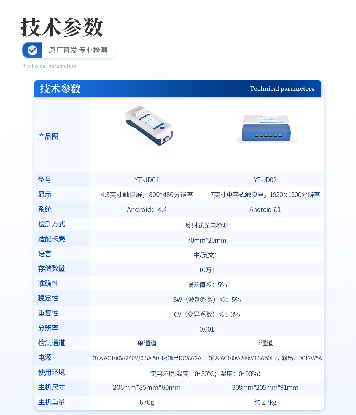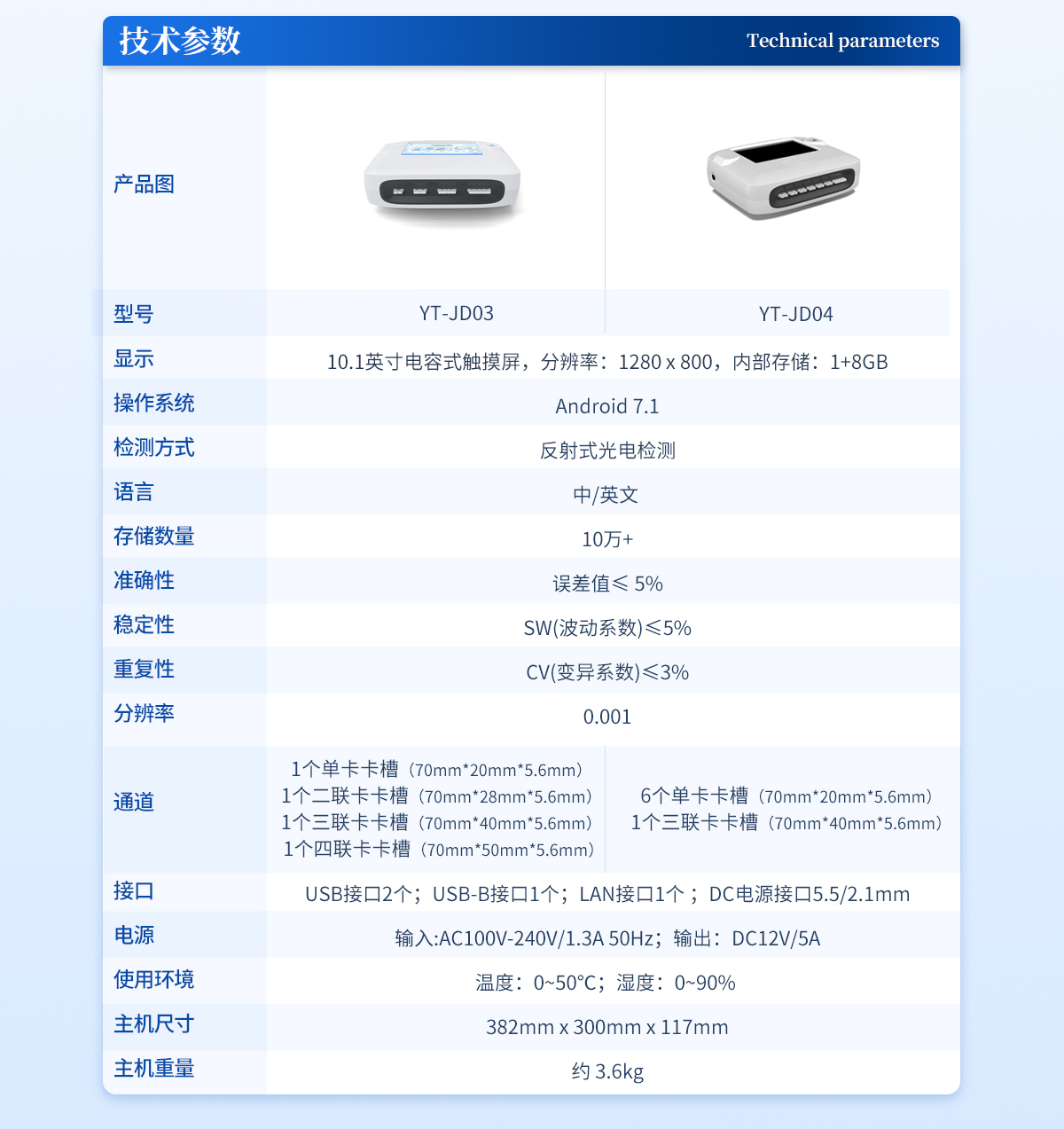 | 1、 屏幕:4.3英寸触摸屏,分辨率:800*480,内部存储:1+8GB | 2、 操作系统:Android:4.4 | 3、 检测方式:反射式光电检测 | 4、 适配卡壳:70mm*20mm | 5、 语言:中/英文: | 6、 存储数量:10万+ | 7、 准确性:误差值≤:5% | 8、 稳定性:SW(波动系数)≤:5% | 9、 重复性:CV(变异系数)≤:3% | 10、 分辨率:0.001 | 11、 检测通道:单通道 | 12、 检测时间:<:5秒;可对样本进行胶体金定性> | 13、 插卡判断:检测卡未插入检测通道不能检测 | 14、 数据传输:WiFi、蓝牙、Type-C | 15、 数据处理:可通过通讯端口进行数据汇总、上传监管平台等 | 16、 检测通道孵育检测一体,温度范围::室温:+5℃:~:60℃ | 17、 打印机:热敏打印机(热敏打印纸:57*20mm) | 18、 电源:输入AC100V-240V/0.3A 50Hz;输出DC5V/2A | 19、 电池容量:6000mah: | 20、 显示电量 | 21、 使用环境:温度:0~50℃;湿度:0~90%: | 22、 主机尺寸::206mm*85mm*60mm | 23、 主机重量:670g |