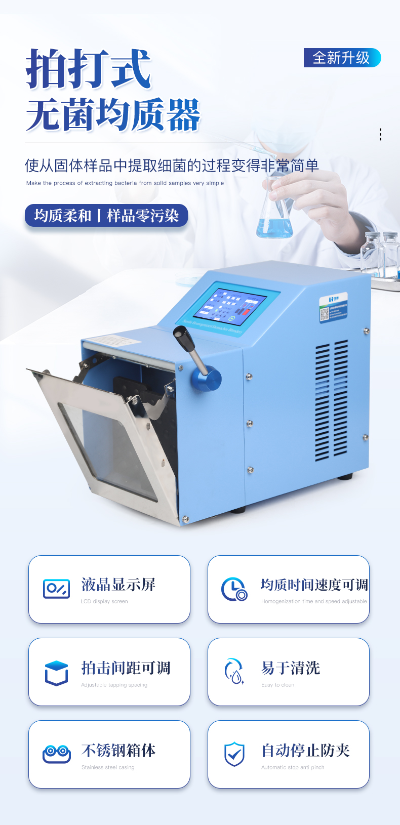 ●5英寸液晶显示屏。 ●可储存三组工作程序。 ●可调整的均质时间。 ●均质速度可调节或固定。 ●拍击器可调整前后距离。 ●无菌一次性滤袋,保证卫生。 ●全开启式门,易于清洗。 ●玻璃透明窗口易于观察 。 ●样品与均质仪无接触,如无样品泄露则不需进行系统清洗. ●均质柔和、样品零污染、无损伤、不升温、不需要灭菌处理,不需洗刷器皿。
