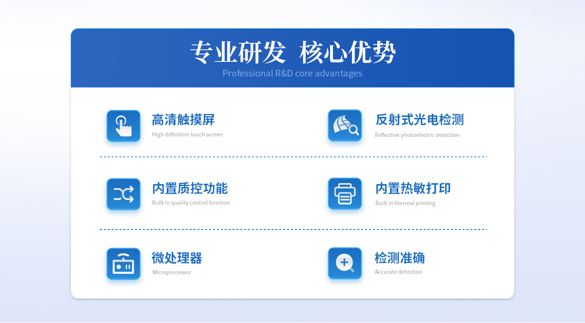 | 1、 Android触控系统结合大尺寸高清屏幕,界面友好,操作简单流畅,无需外接设备; | 2、 6通道可以同时检测不同项目,显著提升检测效率,满足批量样本快速处理需求; | 3、 二维码扫描录入样本信息,避免人工错误 | 4、 8G超大容量内存,支持按日期灵活查询、预览、删除结果,并生成多样化专业报告。 | 5、 内置热敏打印机,检测完成即可现场打印标准报告,提升工作效率。 | 6、 关键部件实时自诊断功能,保障仪器长期稳定运行。 | 7、 高速有线/无线网络及蓝牙,构建完善的数据监控平台,实现数据实时上传、远程查询、统计分析和监管协同。 | 8、 丰富的接口设计,轻松连接电脑、U盘、网络及上位机系统,支持U盘导出。 | 9、 孵育模块为特定试纸条反应提供**温度环境。 | 10、 流线型结构,紧凑轻便,兼顾实验室耐用性与检测需求。 | 11、 插卡判断:检测卡未插入检测通道不能检测 | 12、 内置质控功能,可设备送检、设备自检、试剂卡自检 | 13、 检测方式:孵育检测、即时检测(对检测数据复检核实) | 14、 检测曲线:可以对试剂卡的检测核验,防止误判 | 15、 检测结果:报告出检测项目、被测物质的浓度、检测单位、被检查单位、检验员、检测时间、检测限等信息可在触摸屏上显示,可通过仪器内置打印机输出 | 16、 项目管理:支持检测项目拓展功能 | 17、 界面设置:可修改标题和页尾信息,灵活展示仪器信息 |