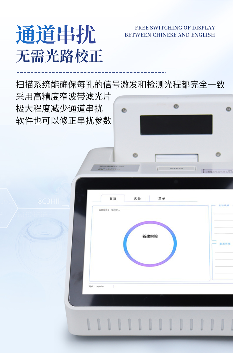 | 1.智能操作系统,实验尽在掌握 | A双模式灵活控制:支持通过仪器触摸屏独立运行,也支持通过电脑软件进行远程控制与数据管理,适应不同实验场景需求。 | B程序更新与预设:支持在线更新实验程序,并内置丰富的预设实验程序模板,用户亦可自定义保存常用模版,实现一键快速启动,极大提升操作效率。 | C极简启动体验(可选配):可定制集成摄像头扫描系统,用户只需扫描样品板或程序卡的二维码,即可自动识别并调用对应实验程序,简化流程,避免人为设置错误。 | D操作简单:无论是触摸屏界面还是电脑软件,均设计得直观易懂,新用户也能快速上手。预置常用程序模板,进一步简化操作流程。 | 2.精准稳定的温控与光学核心 | A长久精准的温控系统:采用进口***TEC半导体制冷模块,控温精准(±0.1°C),孔间温度均匀性**(≤±0.3°C)。系统稳定性卓越,长期使用性能衰减小,校准周期长达数年,显著降低维护成本与运营中断。 | B免维护的灵敏光学系统:配备4个独立LED光源与4个独立光电二极管检测器,实现四通道荧光同步精准检测。采用超长寿命进口光源,设计寿命期内免维护,无需额外校准或更换,保障检测结果长期一致性与高灵敏度。 | C卓越的数据质量:实验线性相关性高(R²≥0.999),重复性优异(孔间CV值低),确保定量结果准确可靠,数据置信度高。 | 3.**便捷的数据与输出管理 | A多重数据导出方式:支持通过USB存储设备直接拷贝,或经由Wi-Fi无线网络传输数据至本地服务器或云端,方便灵活,满足各类实验室数据管理习惯。 | B丰富的报告导出与打印:支持生成并导出多种格式(如PDF、Excel)的实验报告。仪器兼容USB热敏打印机、蓝牙无线打印机及常规A4打印机,可直接在仪器上或通过电脑一键导出并打印专业报告,便于结果存档与即时分享。 | 4.快速**与坚固耐用 | A升降温速度快:优化设计的温控系统具备高速升降温能力,显著缩短单次循环与整体检测时间,提升实验通量。 | B超长使用寿命:核心部件均选用工业级耐用材料与设计,整机运行稳定可靠,致力于为用户提供长久的投资回报。 | 三、应用场景基础科学研究、病原体检测、肉制品掺假、转基因检测、食品安全检测、药物开发及合理用药、基因表达、水体监测、松材线虫检测、宠物检测、养殖业疫病检测 |